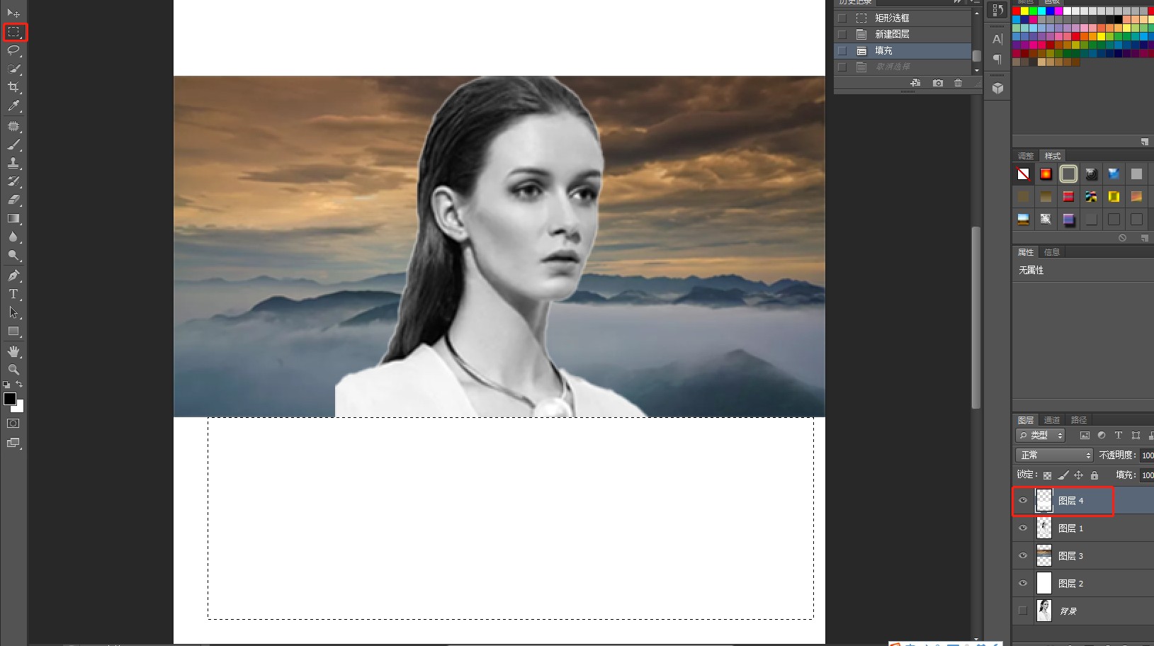 11.  新建一個背景圖層,選擇“矩形選框工具”在多余的區(qū)域畫一個矩形框,調(diào)整圖層將新建圖層置于人物圖層上方。
