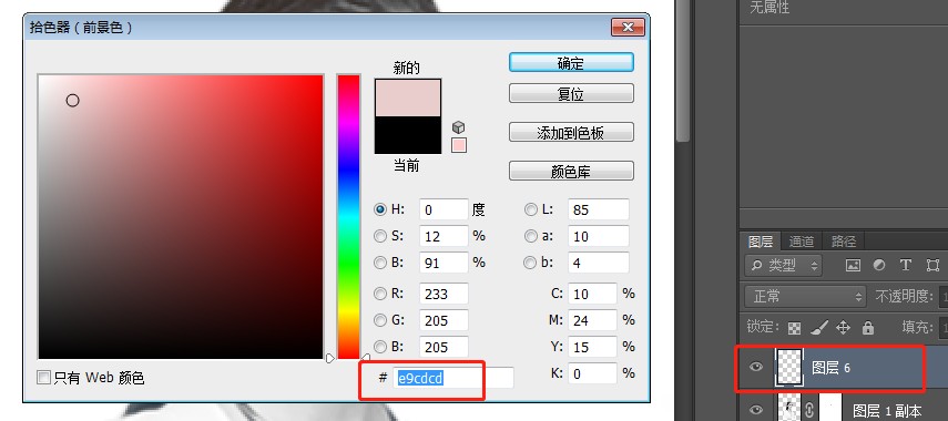 21.  新建一個圖層,設(shè)置前景色的顏色設(shè)置為#e9cdcd,單擊確定按鈕,按住“Alt+Delete”鍵填充前景色。