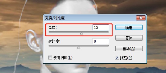 14.  在彈出的“亮度/對比度”設(shè)置亮度值為15,單擊確定按鈕。