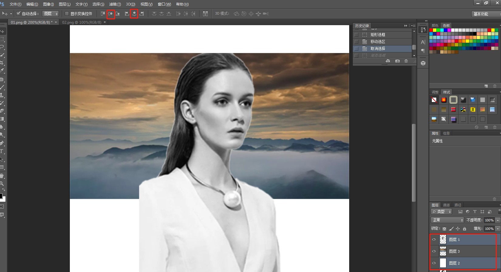 10.  選中人物圖層和白色填充圖層,在屬性區(qū)域選擇“水平居中對齊”、“垂直居中對齊”。