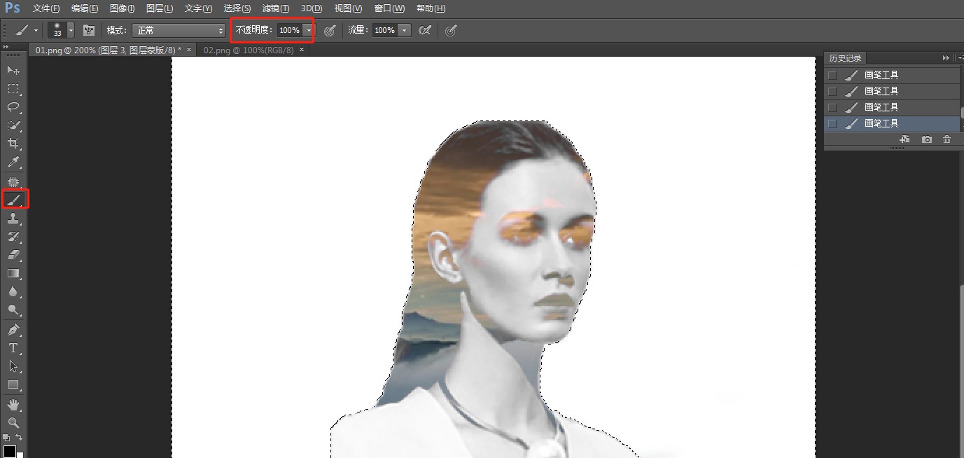 17.  選擇工具箱中的“畫筆工具”,在畫筆工具中設(shè)置合適的筆觸,在設(shè)置不透明度為100%。將虛線外多余的背景全部涂抹掉。(此時虛線內(nèi)的人物是不被涂抹掉的)