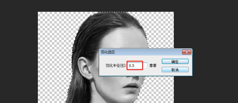 5.     在彈出的羽化選區(qū)對話框中,設(shè)置“羽化半徑”為0.5像素,設(shè)置完畢后,單擊確定按鈕。