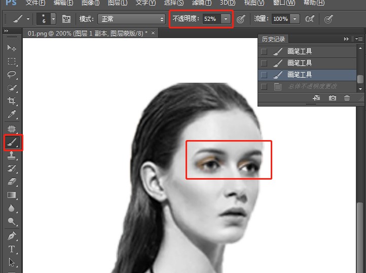 19.  選擇“畫筆工具”,設(shè)置合適大小的筆觸,在屬性欄中設(shè)置不透明度為合適數(shù)值,(這里設(shè)置為52%)在眼部區(qū)域適當進行涂抹。