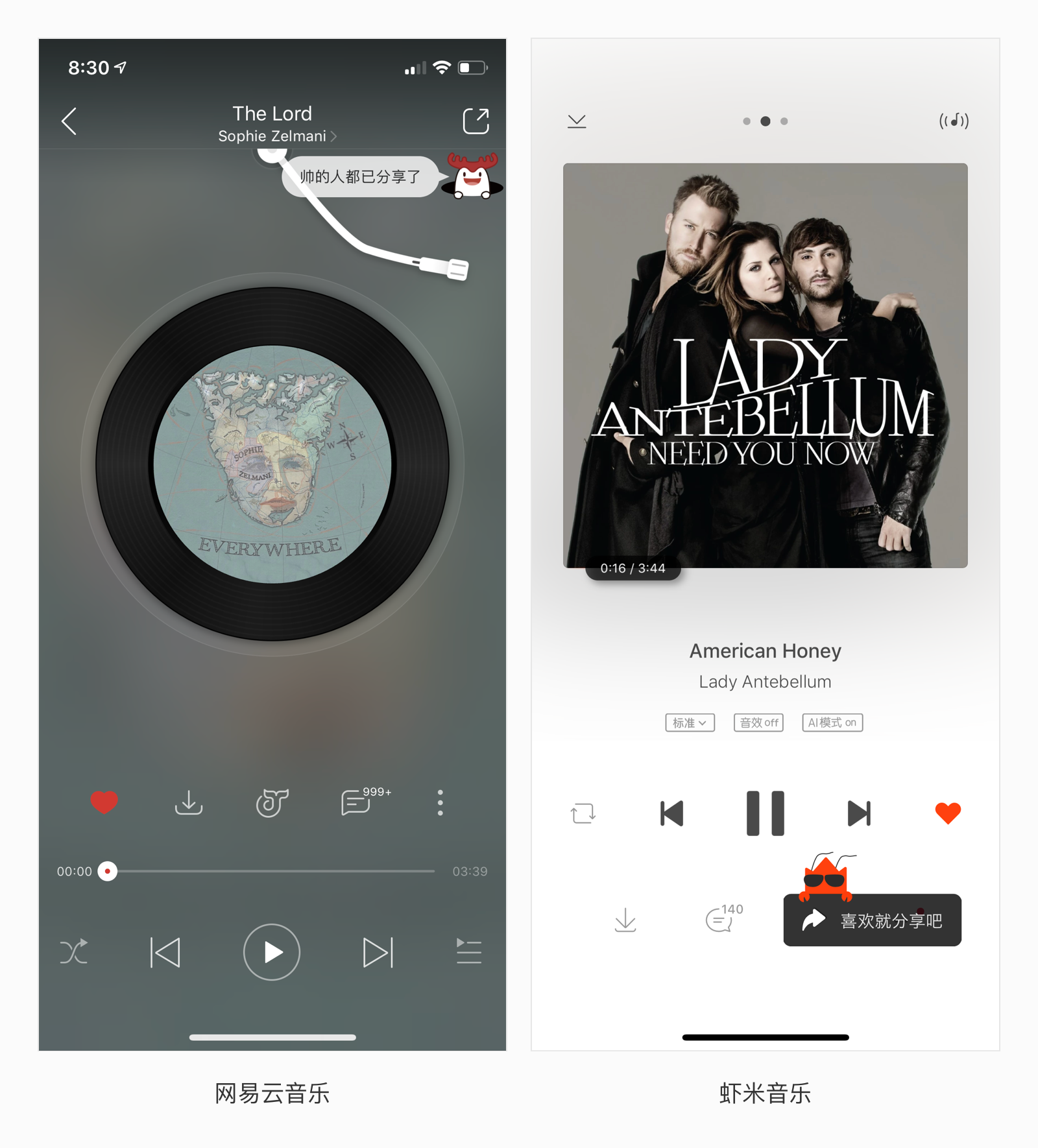 最初看到這個提示是在【網(wǎng)易云音樂】的播放界面里,當(dāng)我收藏喜歡的歌曲時,會在右上方的分享按鈕下方出現(xiàn)分享提示:網(wǎng)易云音樂的吉祥物外加一句足夠有誘惑力的文案:“喜歡就分享吧”,“帥的人都已分享了”等等;最近在蝦米音樂的播放界面中看到了相同的功能。
