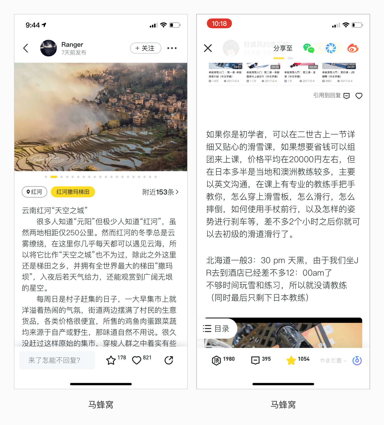 而【馬蜂窩】游記的分享途徑是以彈層的形式出現(xiàn)在導(dǎo)航欄上,出現(xiàn)的時間在用戶閱讀大約2屏內(nèi)容之后出現(xiàn)。因?yàn)轳R蜂窩的游記通常會特別的長,用戶瀏覽一部分內(nèi)容就可以判斷出自己對游記的興趣度或正好有朋友需要,如果一定要等到文章閱讀完成后才可以看到分享途徑,可能會損失一部分用戶的分享,所以這個時候有分享途徑出現(xiàn)可以提升分享效率。