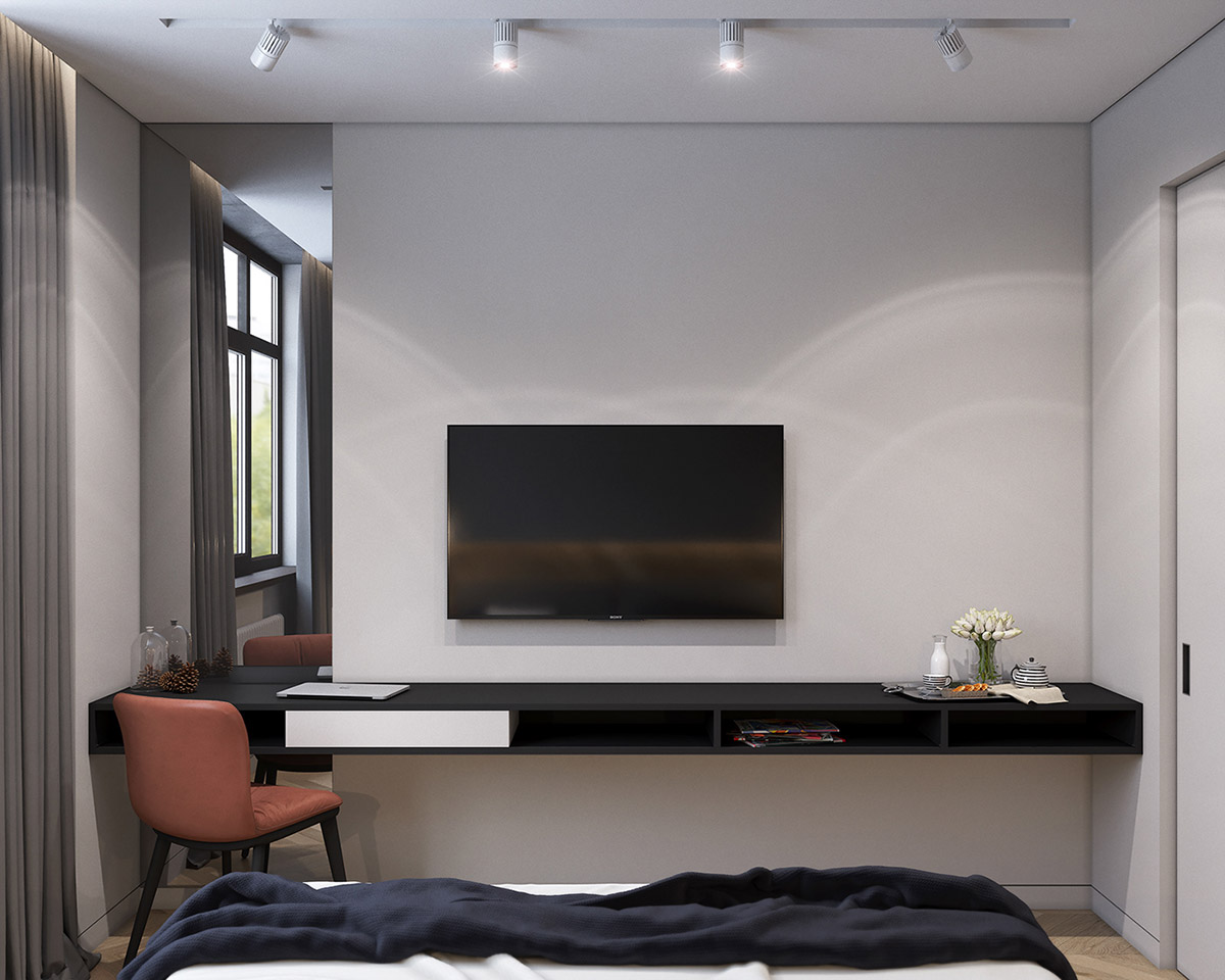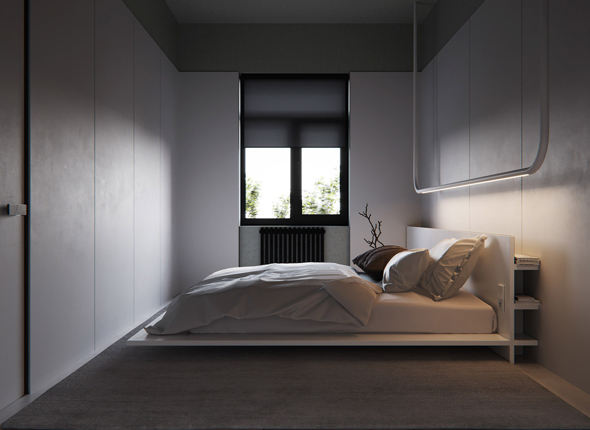 在簡(jiǎn)約的臥室是白色主題,有很大的空余空間,跟這個(gè)臥室?guī)砹艘环謱庫(kù)o。由深灰色封頂。