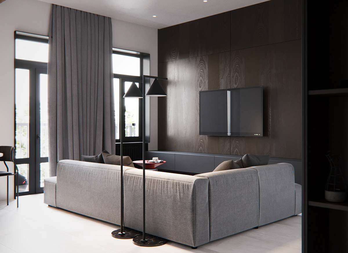 簡(jiǎn)約客廳房間的電視墻是黑灰色的。