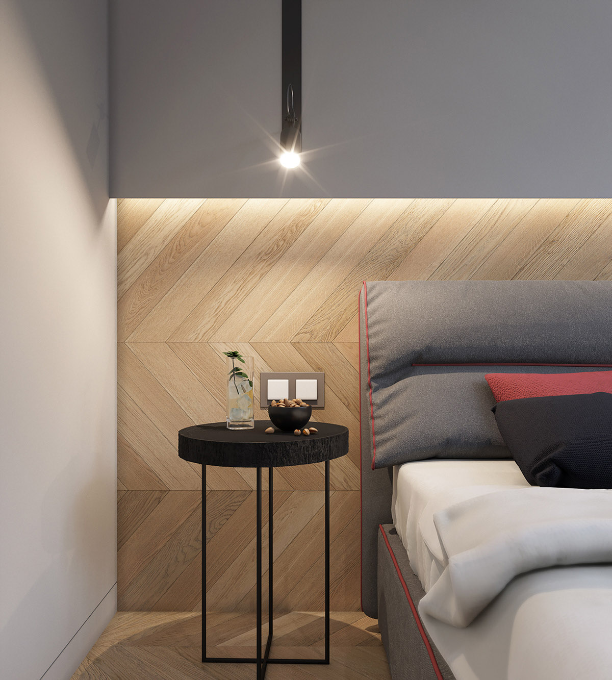 木質(zhì)人字形地板作為床頭板和小側(cè)桌的背景色。