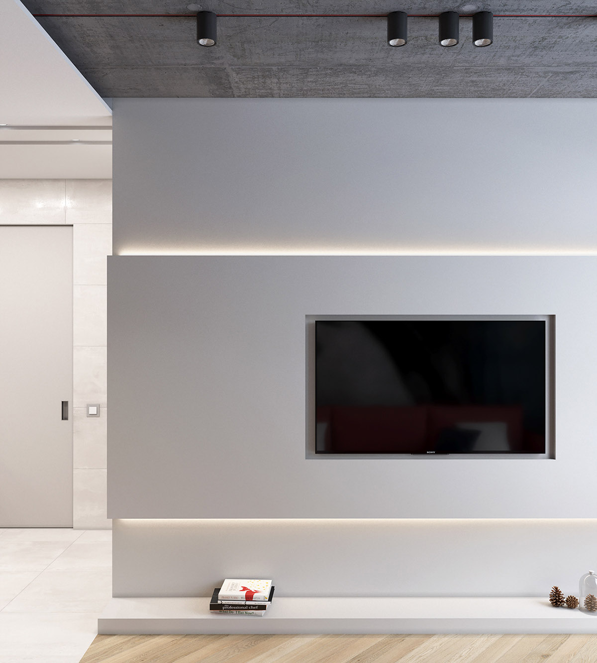該電視墻凸顯層次感的是白色墻壁,而不是顏色。