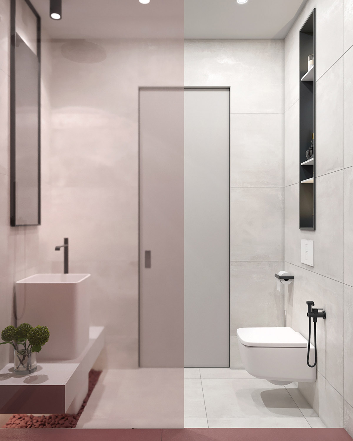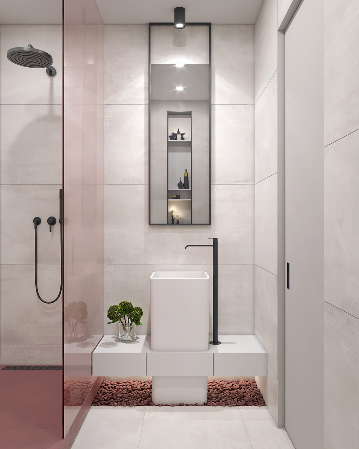 胭脂鵝卵石鋪設(shè)在獨(dú)特的浴室水槽下方,上面是現(xiàn)代化的浴室梳妝臺(tái)。