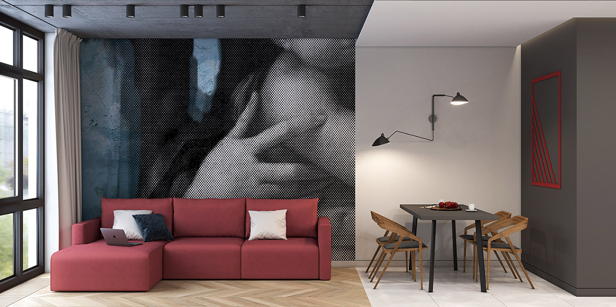 這間客廳配有紅色沙發(fā),旁邊有一個(gè)小餐廳。后面的數(shù)字墻壁壁畫是灰色和對(duì)比藍(lán)色調(diào)。