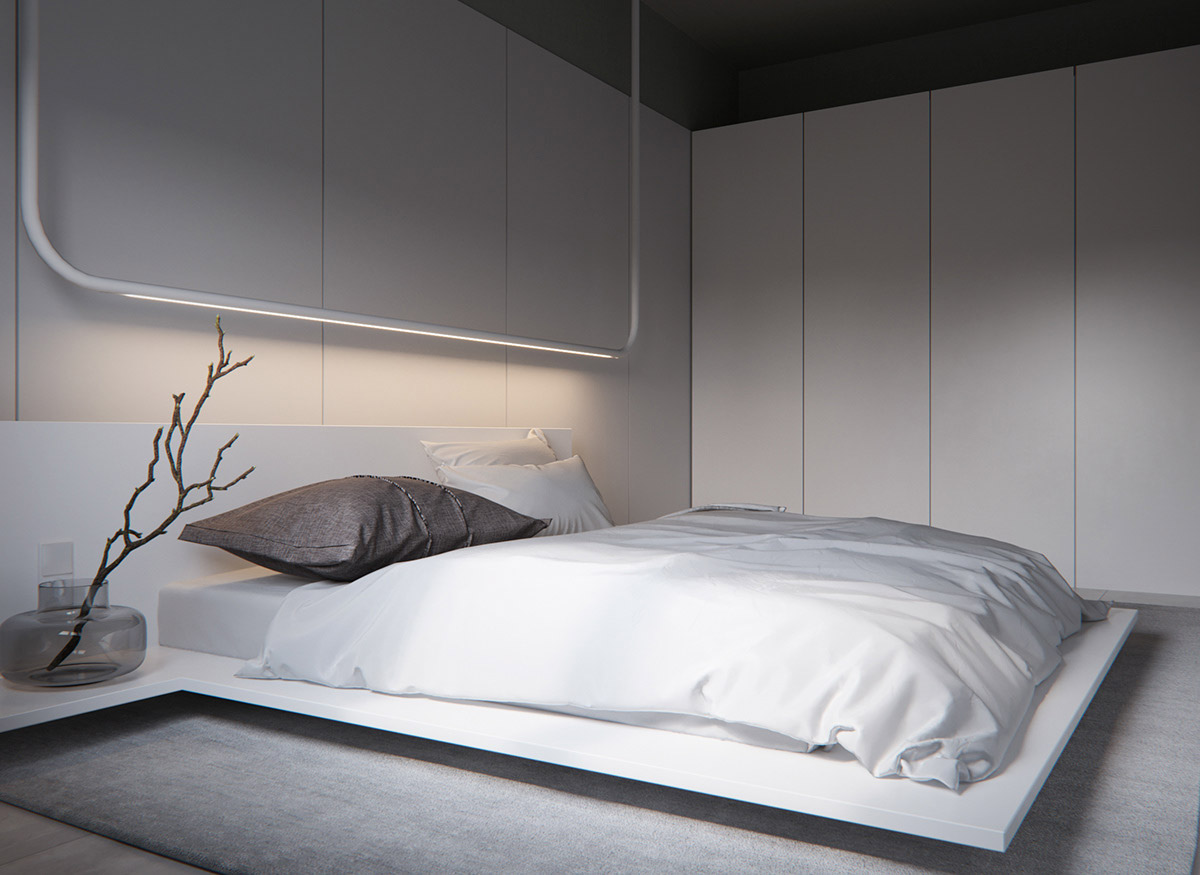 定制的燈光裝置照亮了平臺(tái)床的頭部。