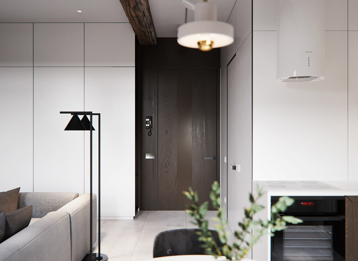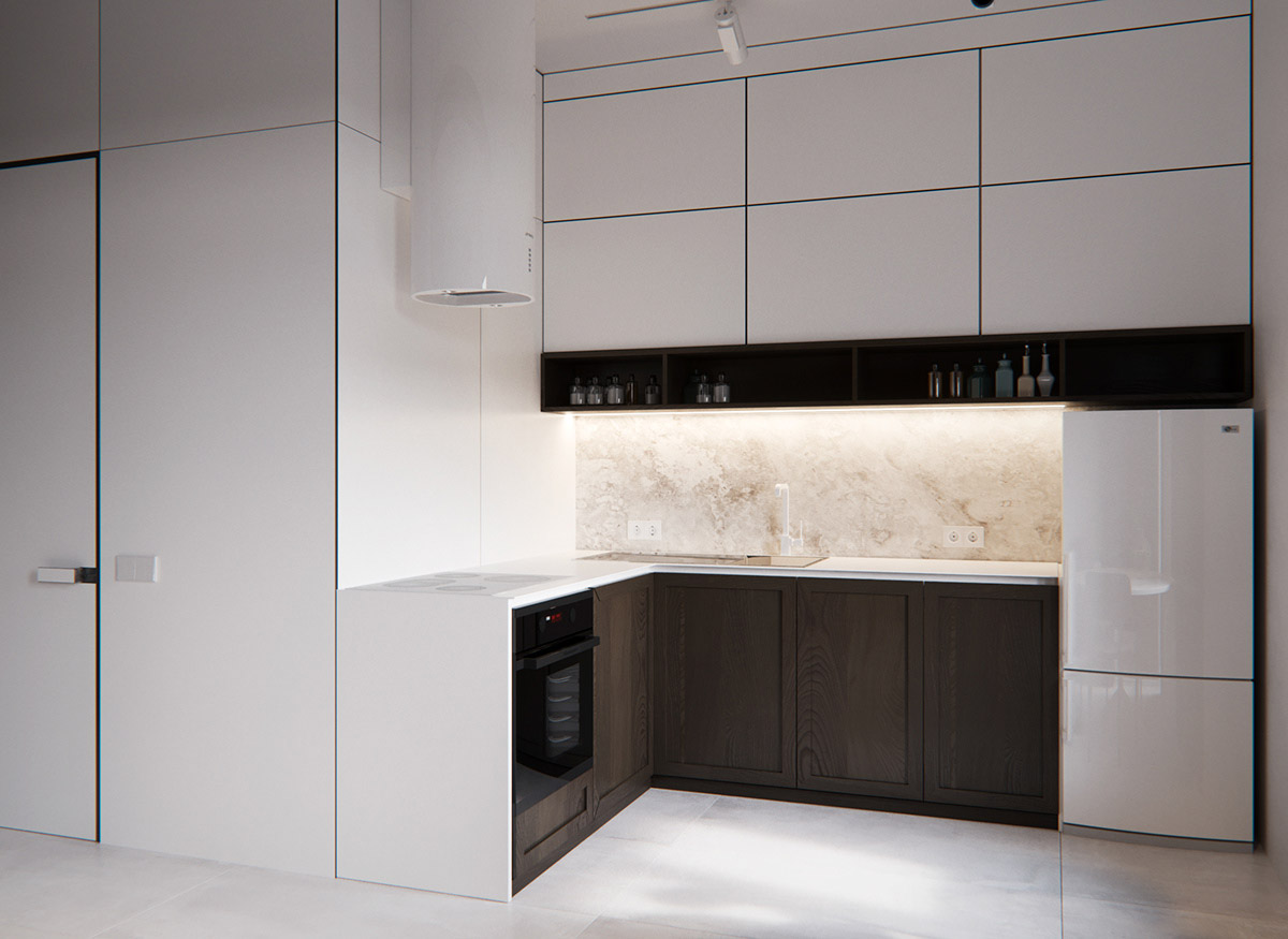 用餐區(qū)有著一個(gè)L形廚房,配色為白色,黑色,深木色。
