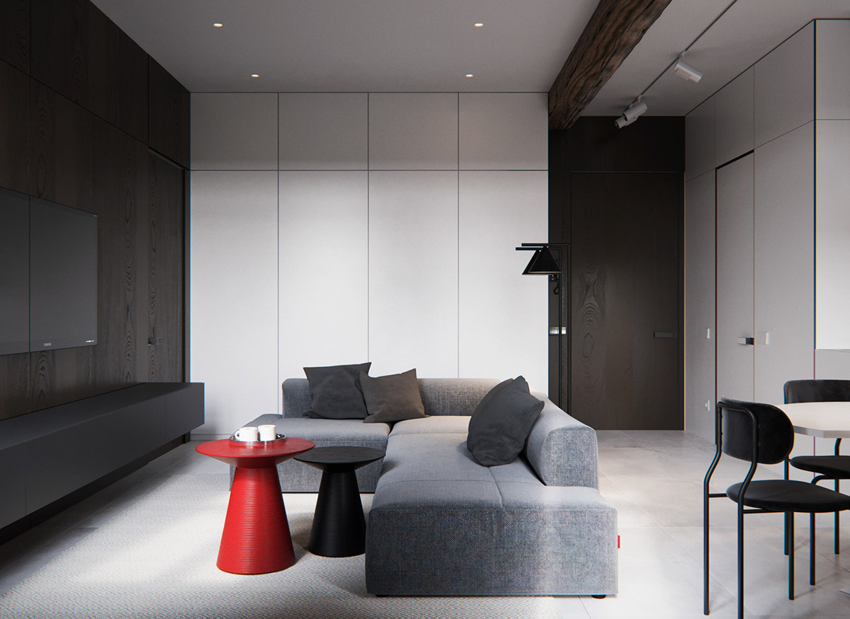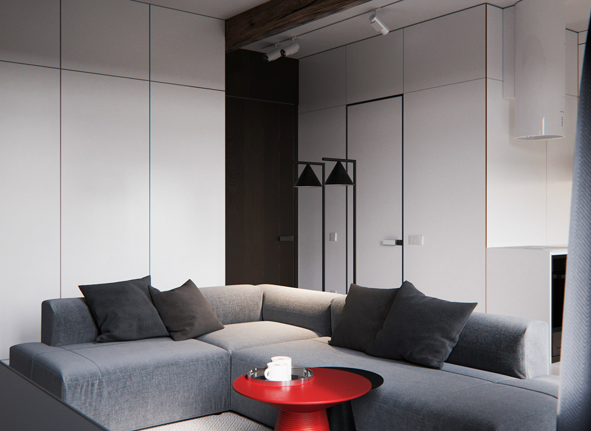 白色簡(jiǎn)約公寓中擺放著一個(gè)紅色的咖啡桌。給整個(gè)套間帶來了一絲現(xiàn)代流行的感覺。