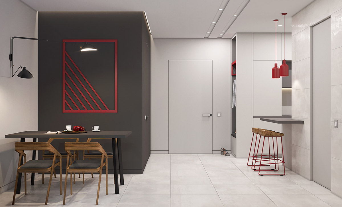 在用餐家具和固定裝置上添加,一塊紅色的藝術(shù)墻可以真正地與木炭墻壁相映成趣。