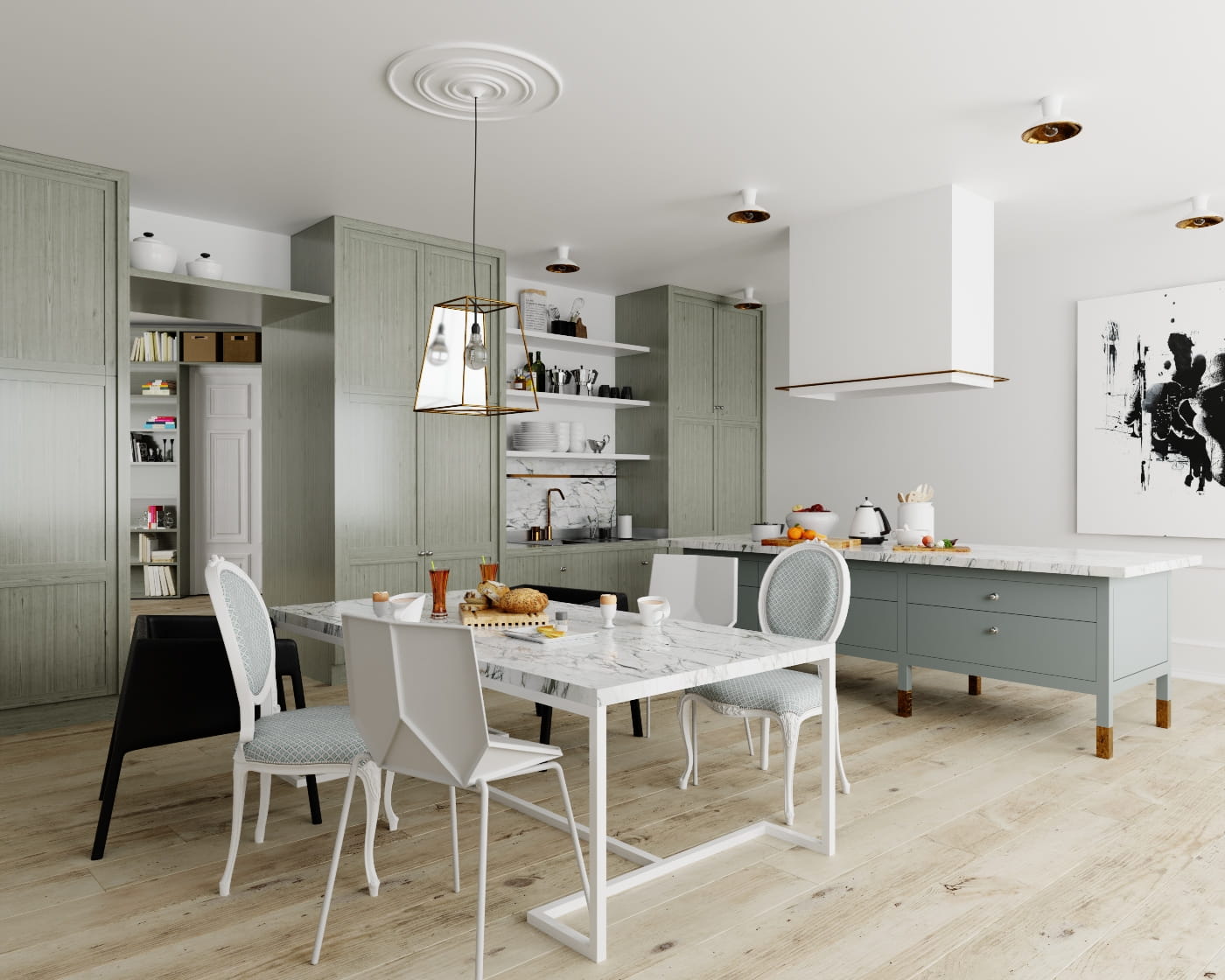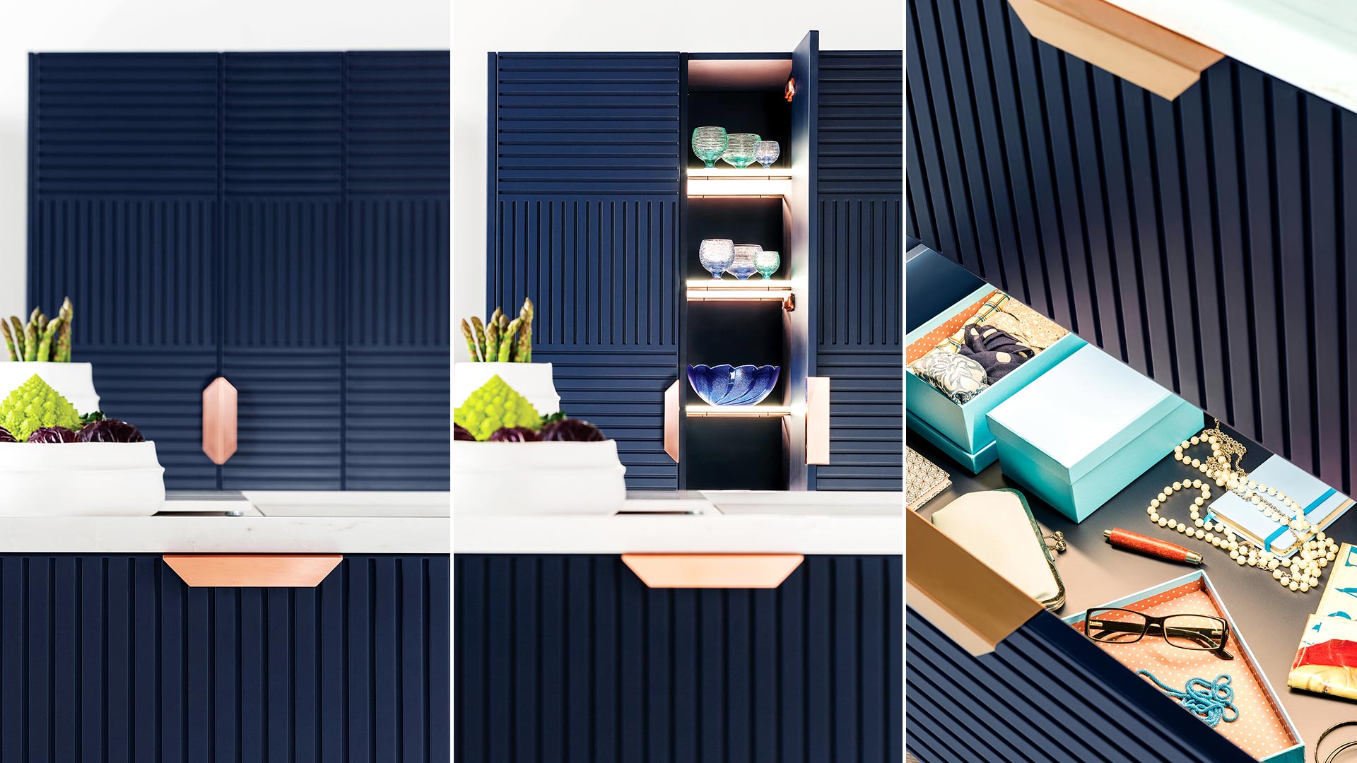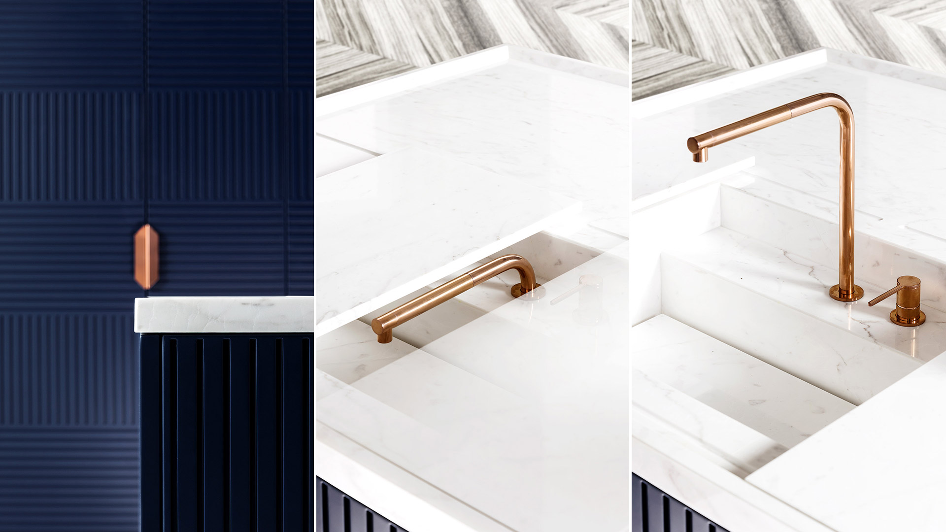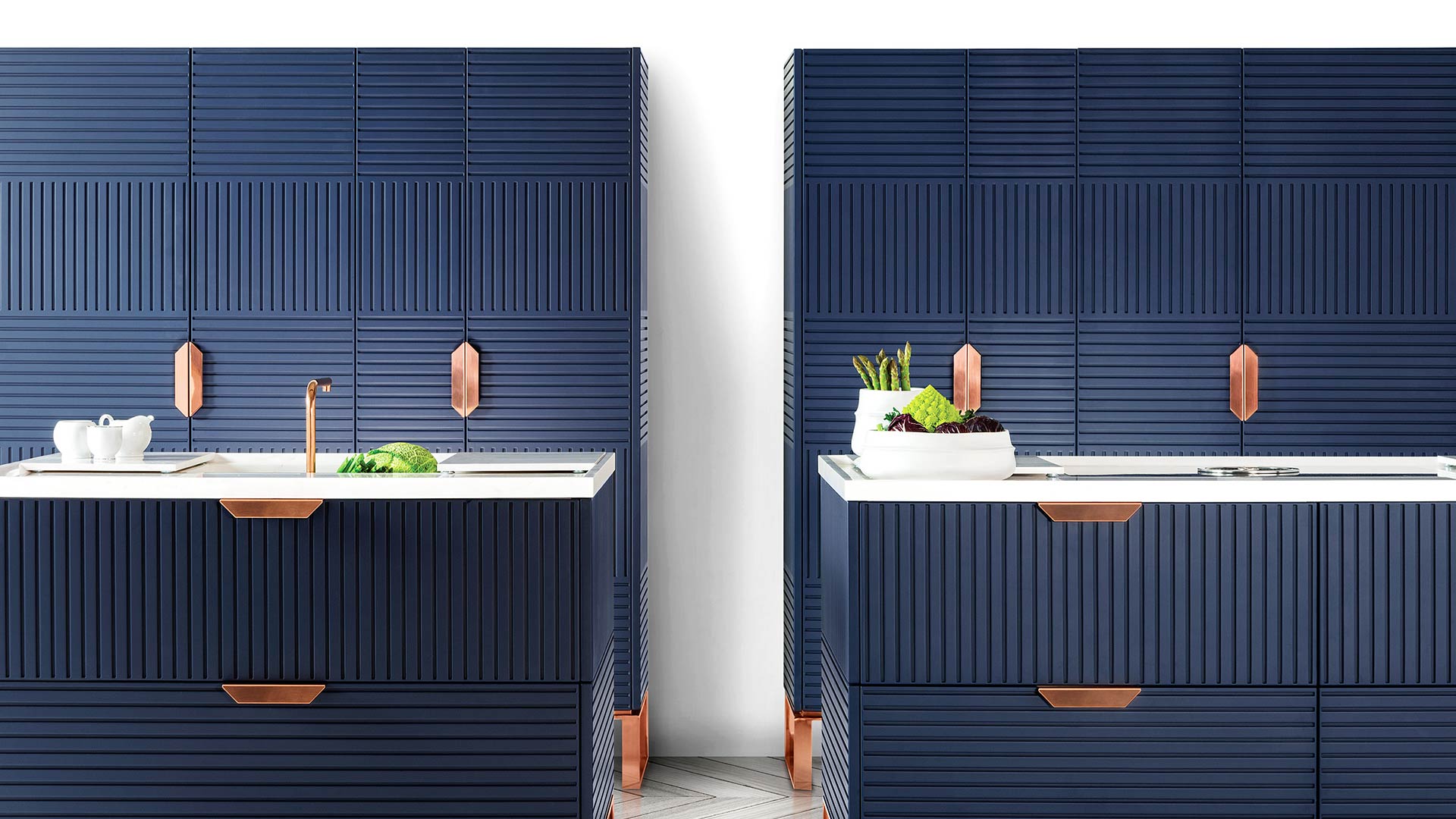 由兩個(gè)衣櫥和兩個(gè)梳妝臺(tái)組成,每個(gè)梳妝臺(tái)都以玫瑰金腿的形式從地面抬起,外觀輕盈,與大多數(shù)現(xiàn)代廚房的沉重,堅(jiān)固的內(nèi)置結(jié)構(gòu)完全不同。