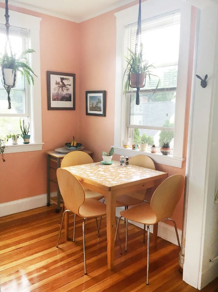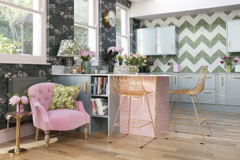 粉紅色、綠色和白色瓷磚、花卉壁紙和郁郁蔥蔥的植物完美融合。
