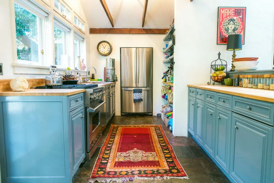 藍(lán)色櫥柜,彩色地毯,漂亮的開放式存儲(chǔ)空間,造型別具一格的水果容器,看起來溫馨并極富生活氣息。