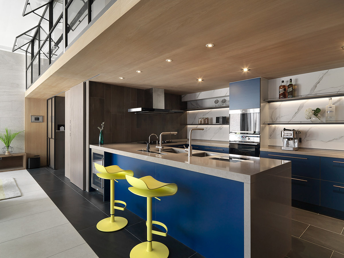 生動(dòng)的黃綠色酒吧凳子與藍(lán)色廚房壁板形成鮮明的對(duì)比。