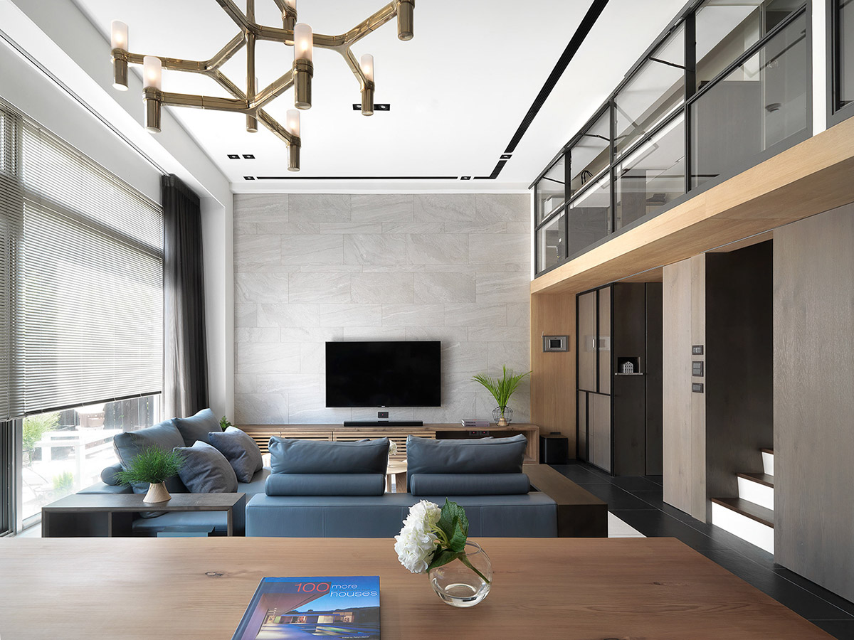 這是一個(gè)夾層樓,中間是一個(gè)開放式的起居室。