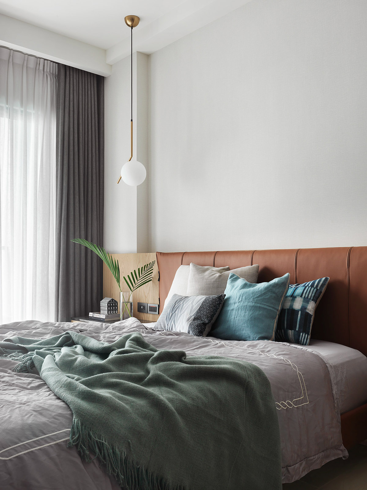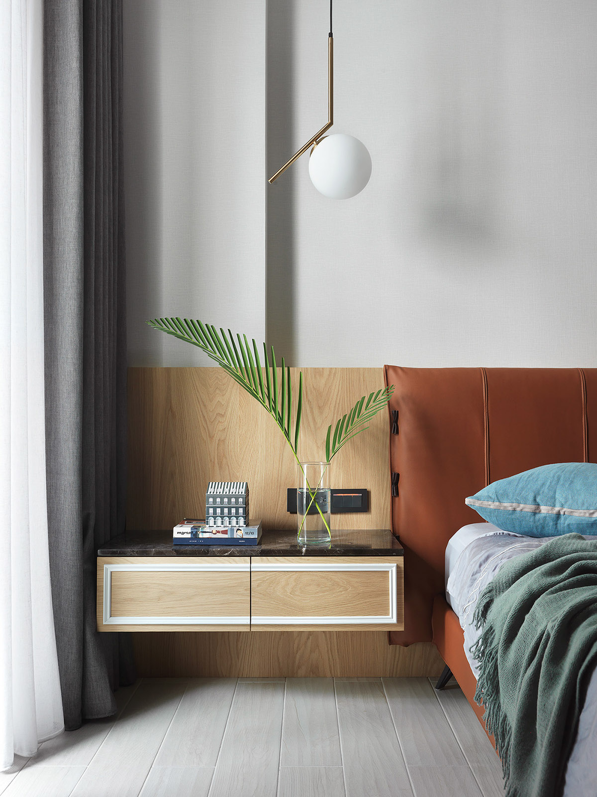 在床的另一側(cè),浮動(dòng)抽屜單元安裝在寬床頭板壁板上。