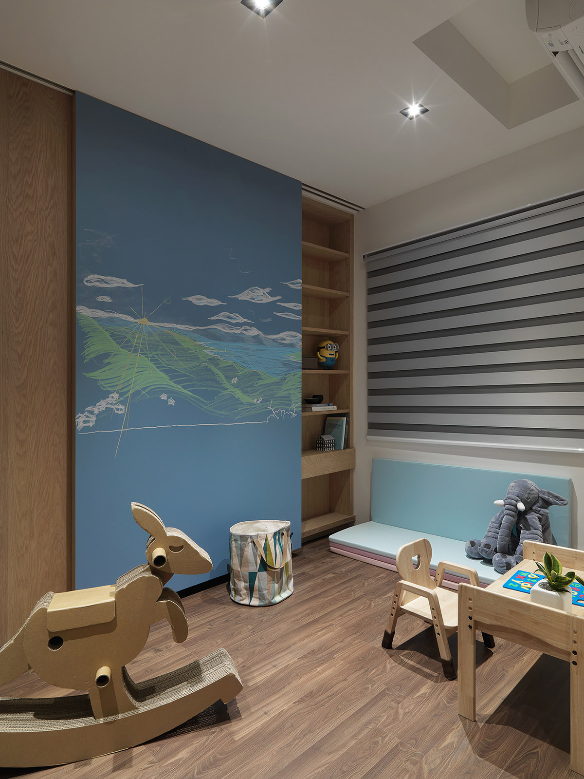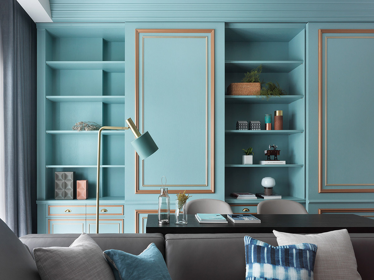 一個(gè)黑色柜臺(tái)后面墻上的隔音層,一組儲(chǔ)物柜是中性白色和木質(zhì)色調(diào),使淡藍(lán)色的沙發(fā)脫穎而出。
