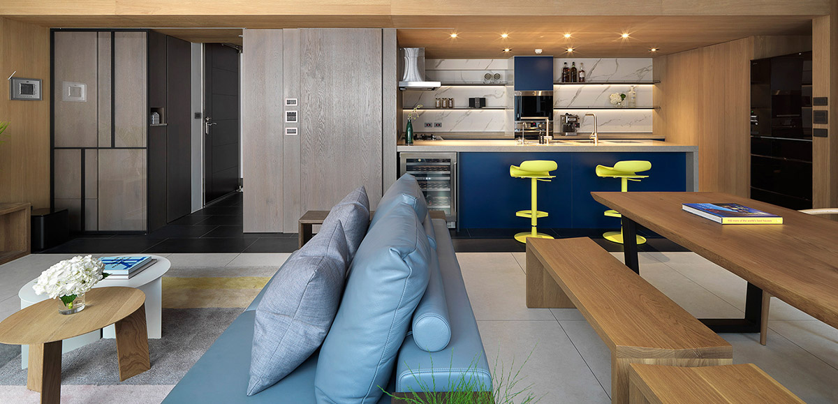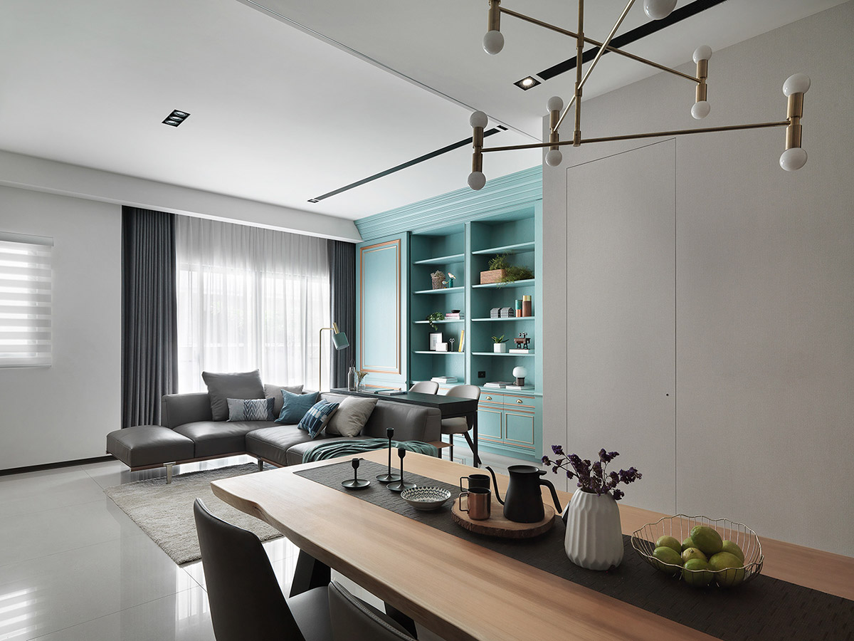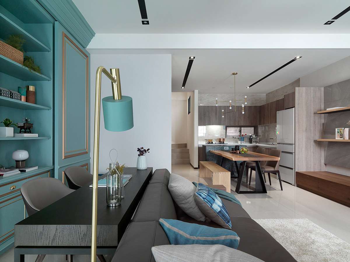 木制餐桌位于沙發(fā)后面,毗鄰藍(lán)色廚房島臺(tái)。