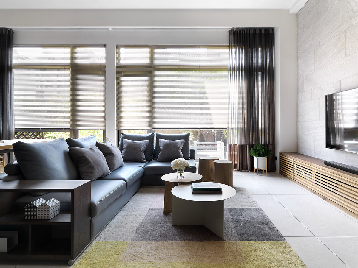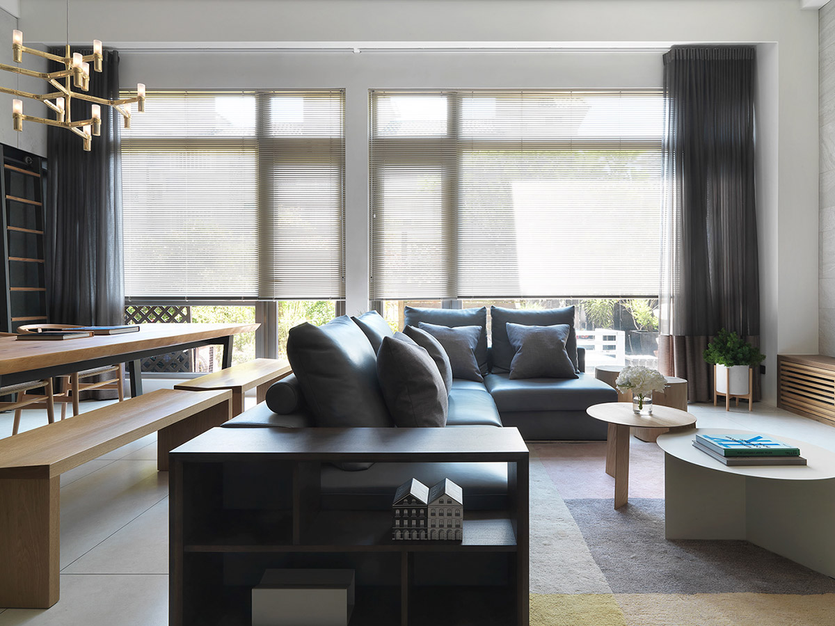 大窗戶采用透明灰色窗簾和百葉窗簾。