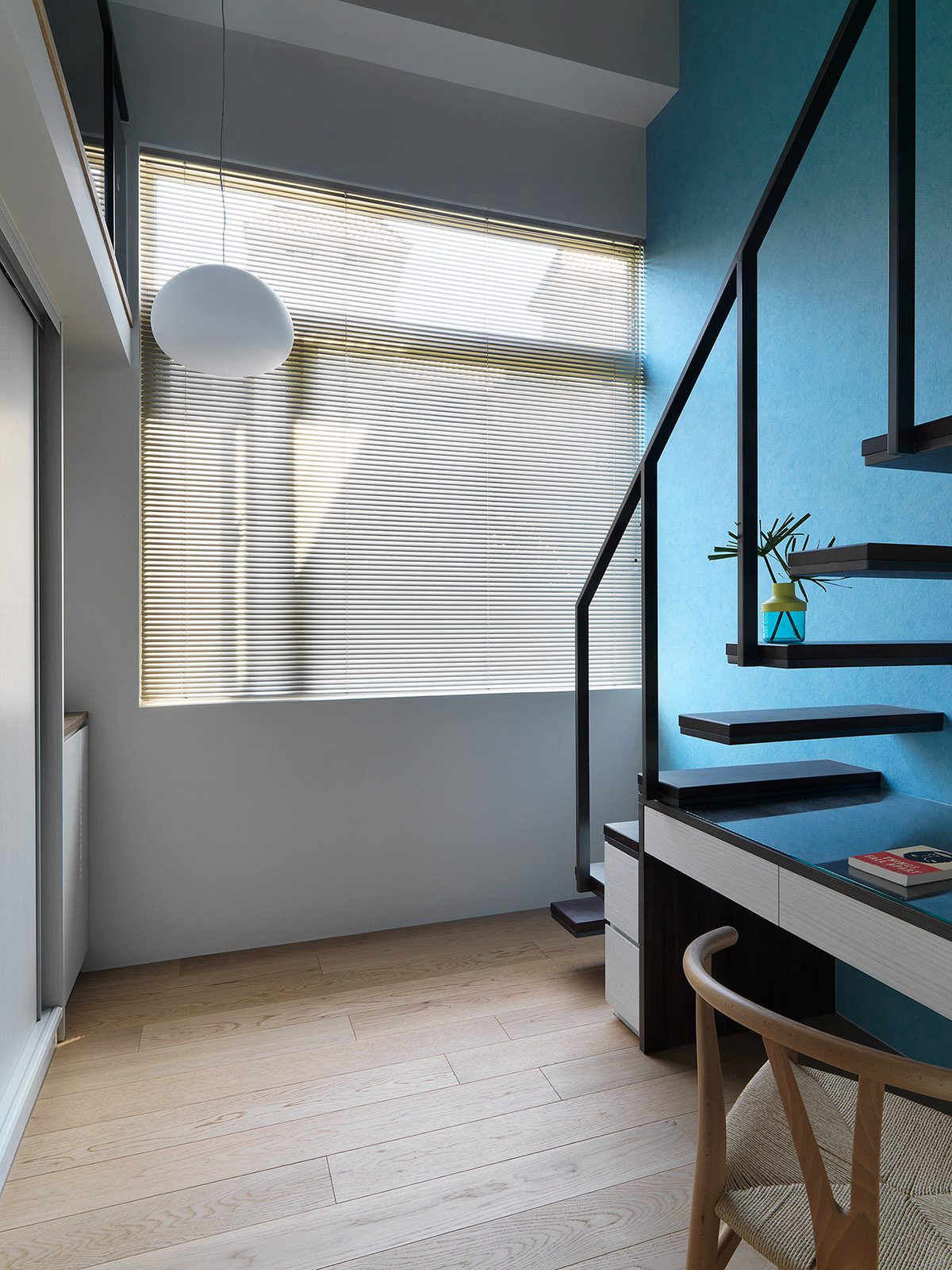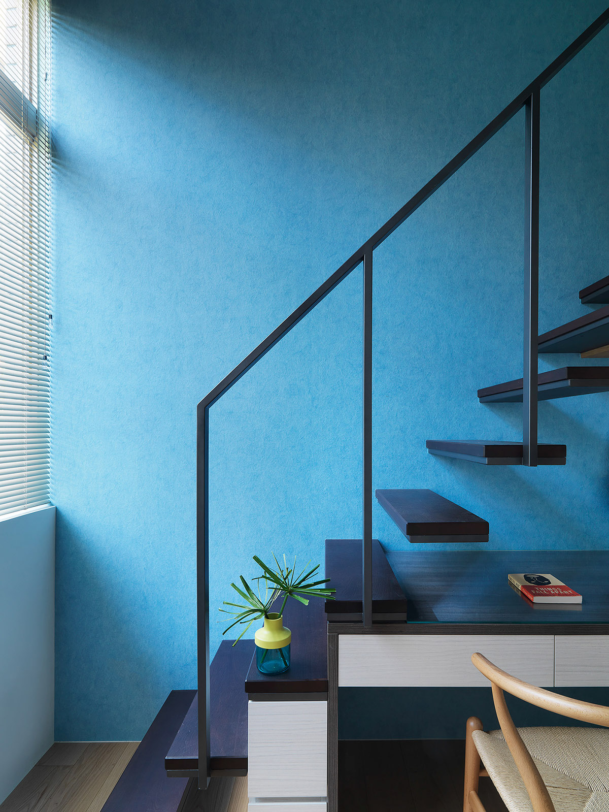 明亮的藍(lán)色墻壁和黑色的懸浮樓梯。