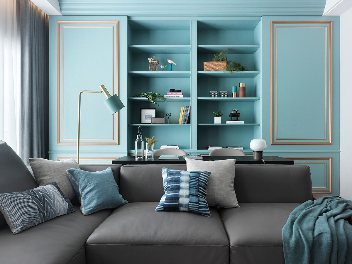 這是一個(gè)令人眼前一亮的藍(lán)色家飾,中藍(lán)色和深藍(lán)色的色調(diào)營(yíng)造出一個(gè)清晰明朗的場(chǎng)景,以生動(dòng)的黃綠色為點(diǎn)綴。