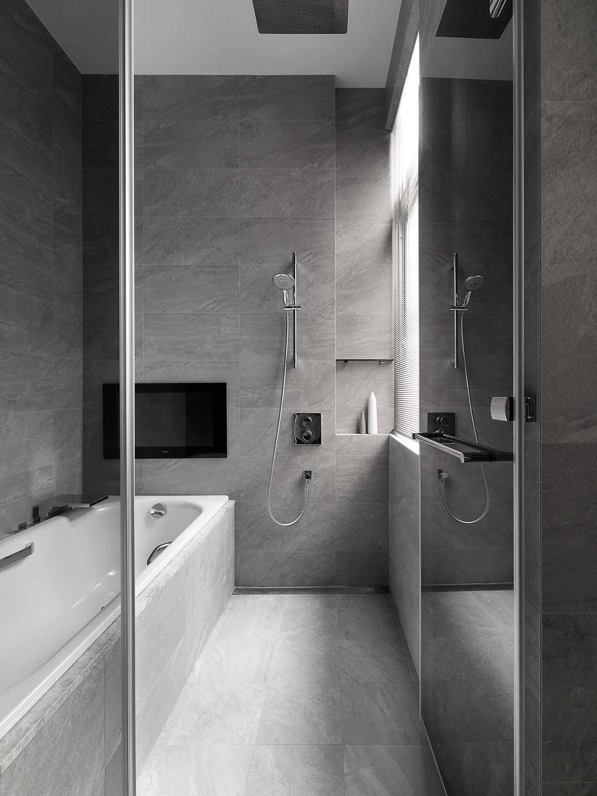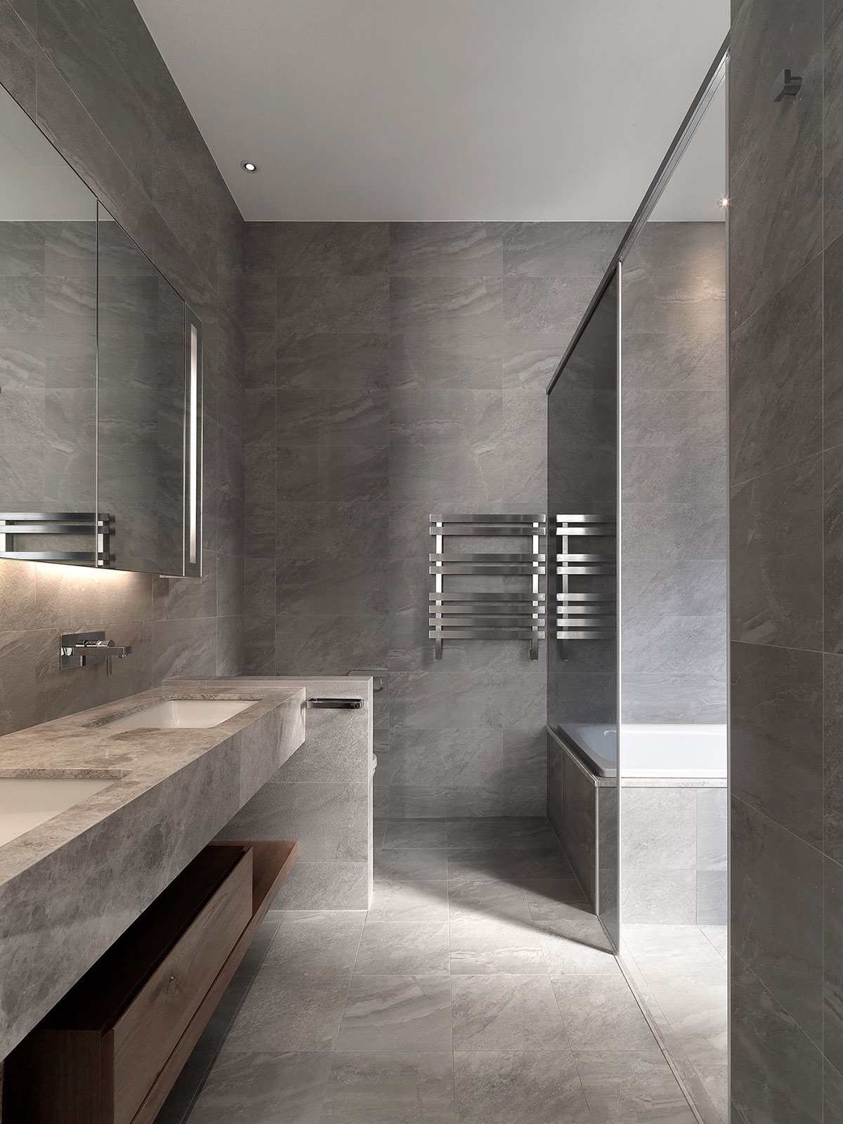 該浴室是一個(gè)輕松的灰色的場(chǎng)景,看不到藍(lán)色。一個(gè)定制的浴室梳妝架,配有雙水槽,與灰色的墻壁融為一體。