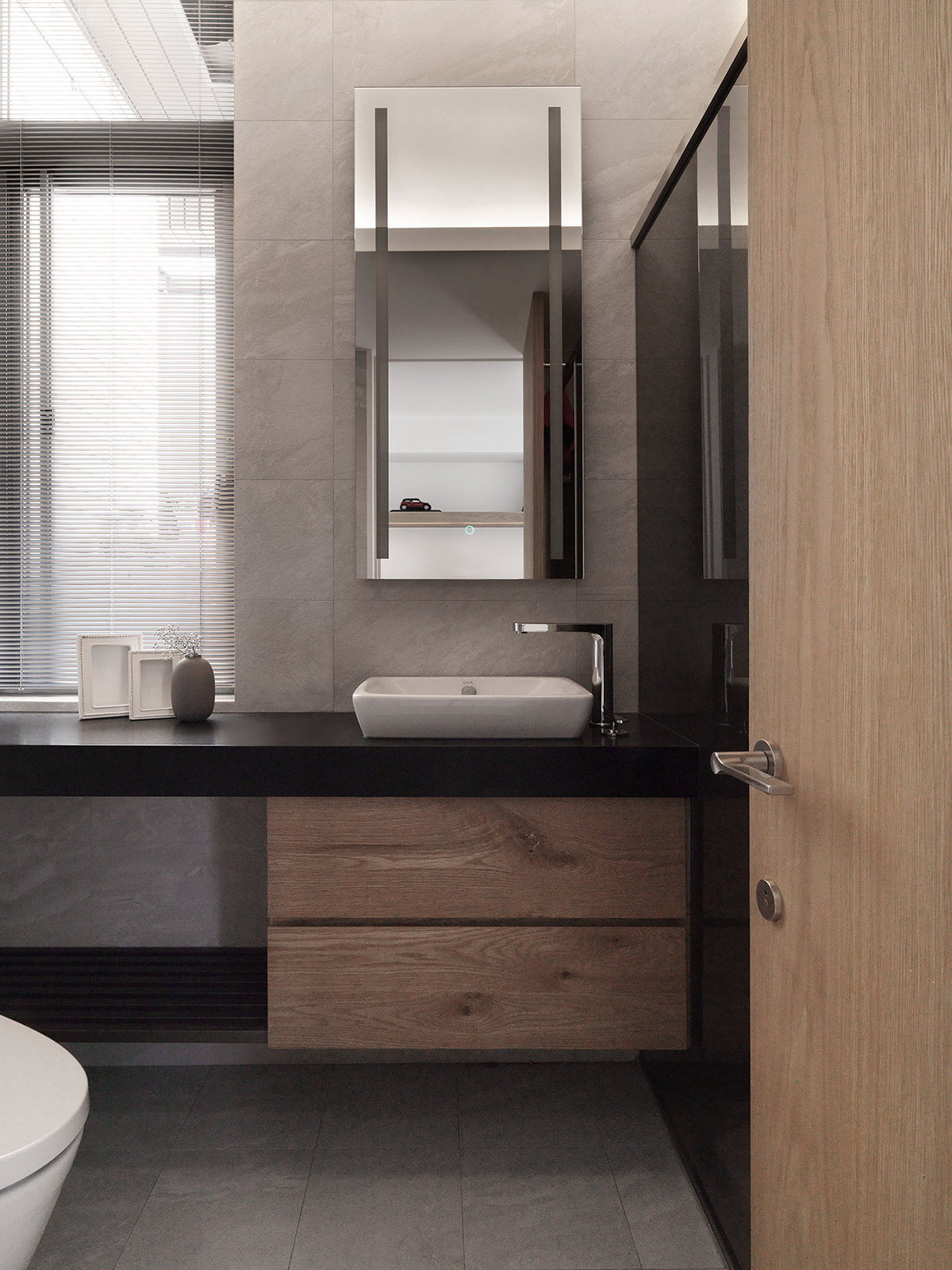 小衣帽間同樣時(shí)尚。這次黑色梳妝臺(tái)帶是木質(zhì)存儲(chǔ)抽屜,與淺灰色墻磚形成鮮明對(duì)比。