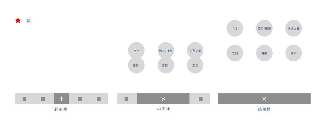 對于無限循環(huán)的動效Demo,若沒有明確標出動效的開始與結(jié)束,容易造成混淆。因此在文檔中,需標明動效的起始狀態(tài),并對中間幀作以標識,便于明確在最小的動效單元中的運動順序。在明確整體動畫效果后,將Demo的關(guān)鍵幀抽離出來并進行標識,可高效的指導(dǎo)開發(fā)過程,同時實現(xiàn)文檔的統(tǒng)一性。