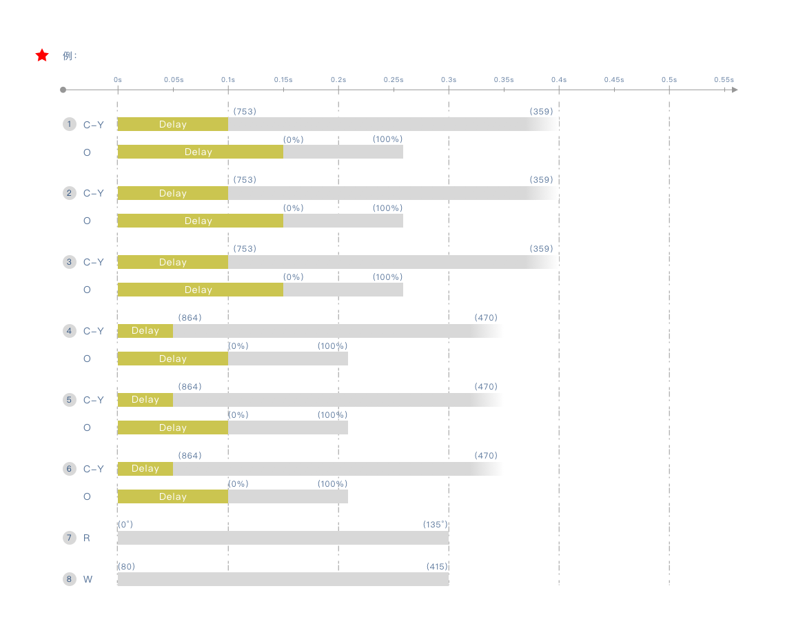 運動參數(shù)是動效過程的數(shù)據(jù)化的體現(xiàn)形式,是動效實現(xiàn)的基本條件。因此,在整個動效規(guī)范中,基于統(tǒng)一的時間起點,將運動對象的屬性值一一映射到時間軸上,形成運動對象的運動參數(shù)表格。在基于同一時間起點,繪制出每一個運動對象延遲時間以及運動的時長,并將不同屬性在起止時間點標識出來,使時間變量與屬性變量對應(yīng)起來,使運動參數(shù)直觀化。