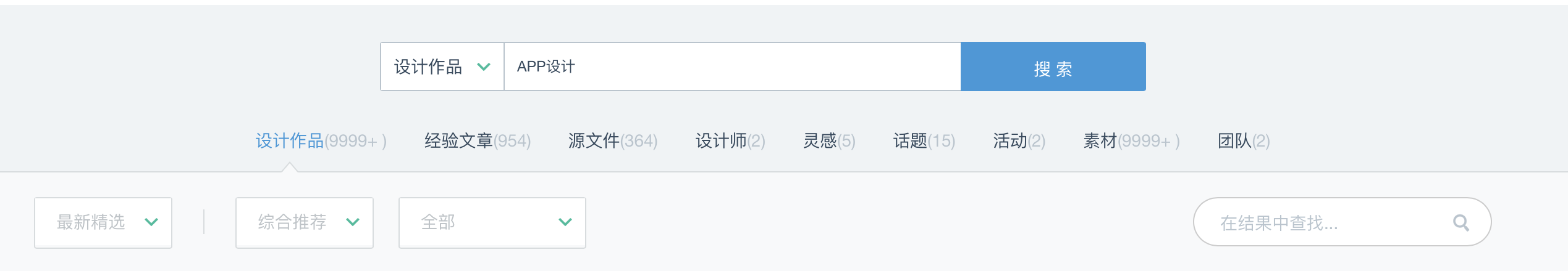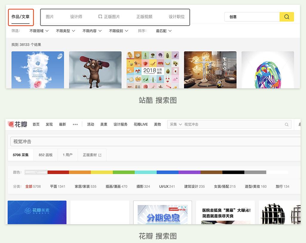 在站酷、花瓣的網(wǎng)站設(shè)計(jì)中,我們也發(fā)現(xiàn)類似的設(shè)計(jì)。分欄目展示搜索結(jié)果時(shí),排在首位的欄目自然是產(chǎn)品中最重要的內(nèi)容,后面欄目?jī)?nèi)容的重要性依次遞減;