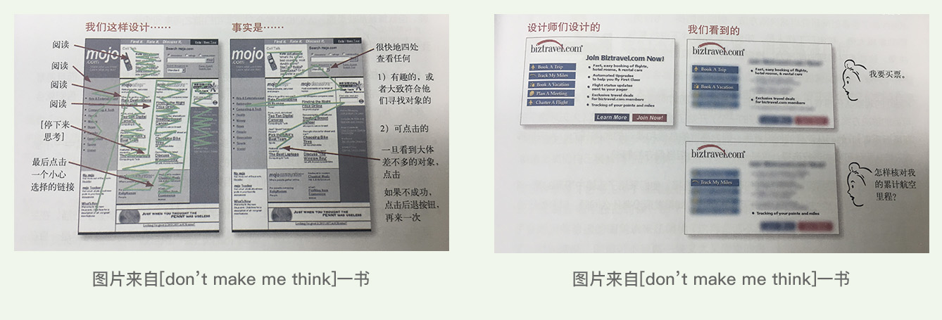 我們?cè)O(shè)計(jì)產(chǎn)品時(shí)會(huì)認(rèn)為所有設(shè)計(jì)都會(huì)被用戶看到,但是不要忘了用戶瀏覽網(wǎng)頁(yè)的方式不是閱讀式的,而是掃描式的。用戶只是在頁(yè)面上掃一眼,吸收到主要的、大概的信息,而不是逐字逐句的去閱讀