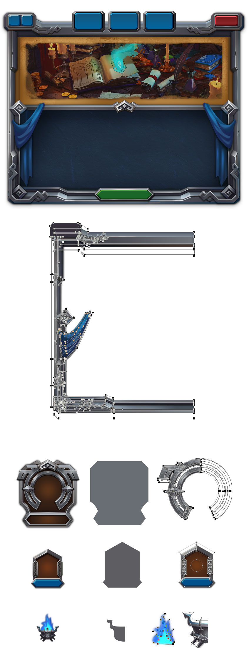 細節(jié)部分:注重體積感,結構之間的穿插關系要合理,材質疊加也有體積感,會有光影的細節(jié)處理,不同質感表現(xiàn)清晰,因為是頁游,所以細節(jié)度很高,裝飾點很多。