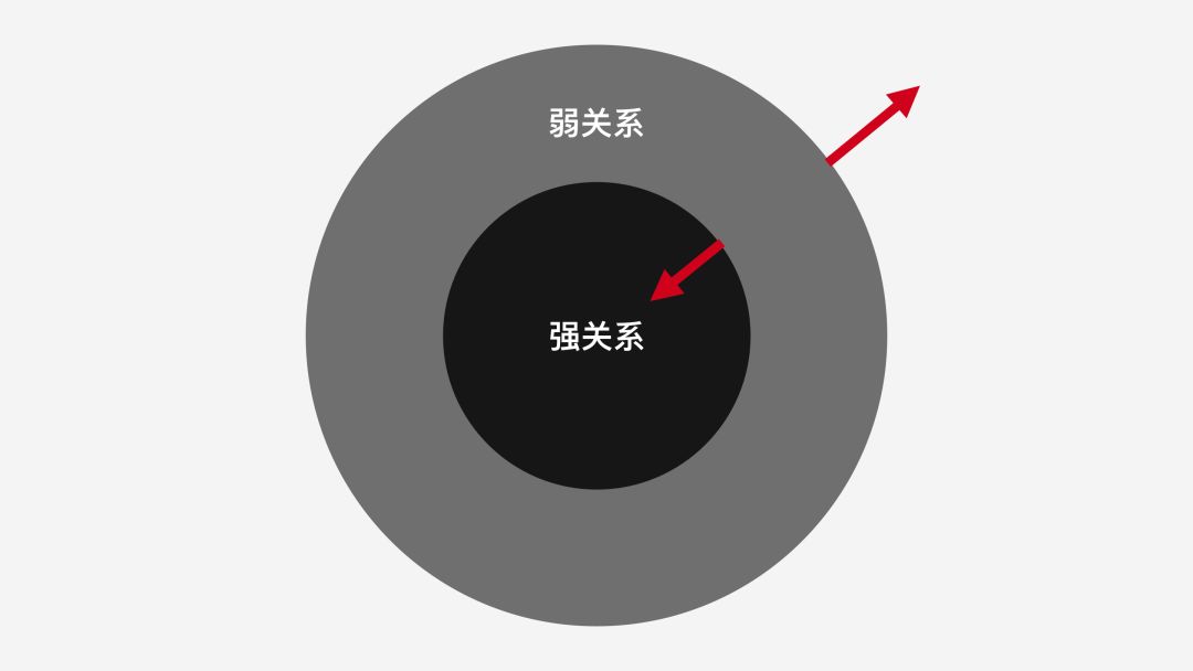 更多的人機(jī)交互、更少的人際互動(dòng),未來(lái)社交將會(huì)是松散而多元。不局限于物理距離,想要和全世界志同道合者Face-to-face,甚至是擁抱,只需要借助VR、AR和體感等技術(shù)就能做到。未來(lái)我們的強(qiáng)關(guān)系圈將縮小,而弱關(guān)系圈將不斷擴(kuò)大(如下圖)。
