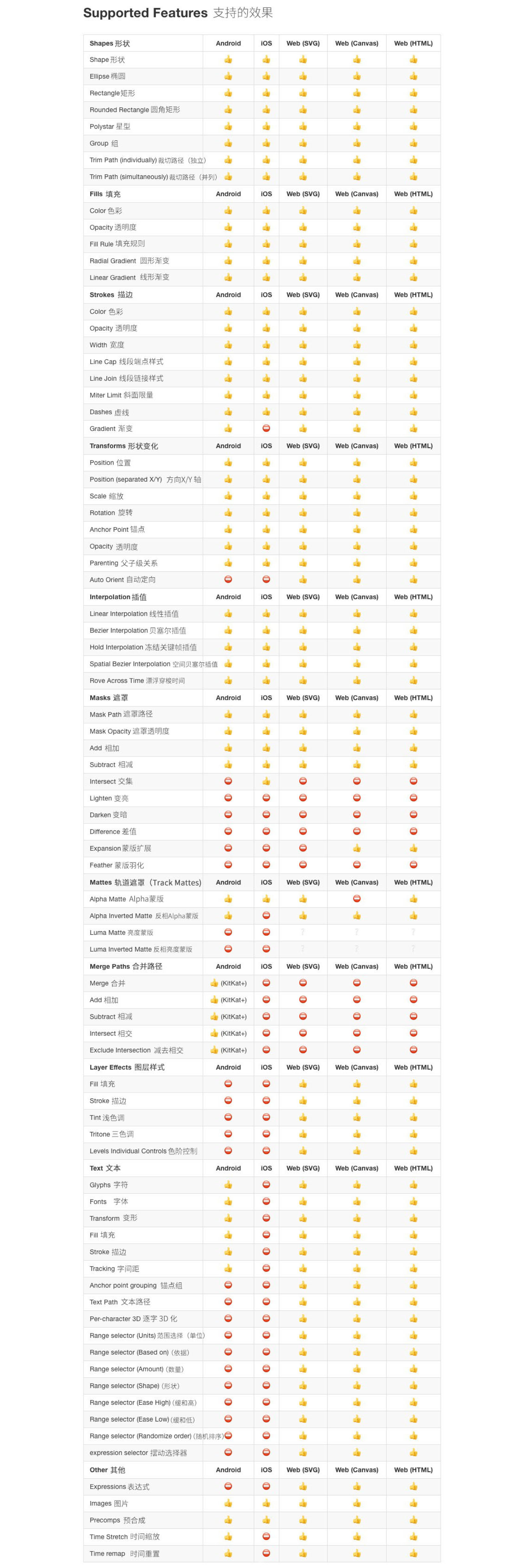 官方文檔寫到的與AE動效設(shè)計有關(guān)的部分,以下是在各個平臺上支持的效果。