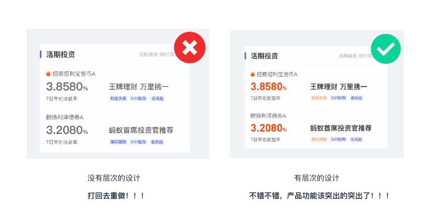 文字的層次感往往和字號大小、字重、色彩明度有關(guān),其中字號大小是提高文字信息層級的重要手段,在文字排版中如果文字之間的層次不清晰,那么一定是大小的對比不夠,在UI中字體大小對比往往在4-8px較為適合。如果通過字號大小的調(diào)整不足以清晰的區(qū)分層級時,再去考慮字體是否加粗,如果當(dāng)前頁面文辭層級過多,可以增加色彩明度的調(diào)整。如下圖所示:
