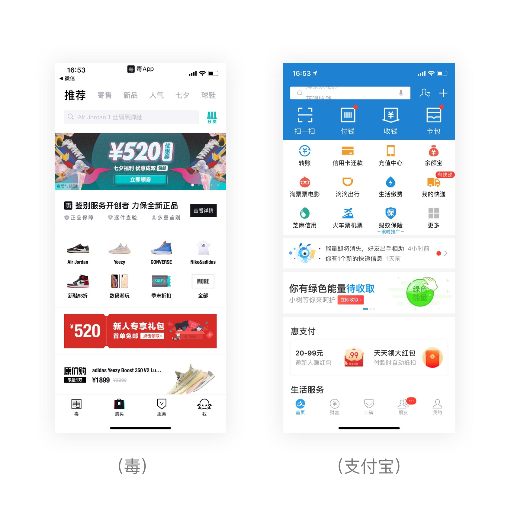 通過線、面將板塊之間進(jìn)行區(qū)分是目前運(yùn)用比較常見的一種方式(如下圖),可以看出在該界面中“毒”是通過線來區(qū)分不同模塊,而“支付寶”是通過分割塊來進(jìn)行模塊與模塊之間的區(qū)分。