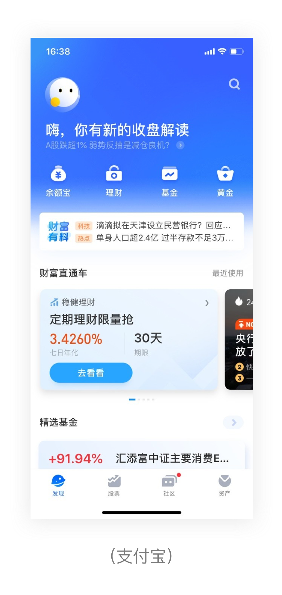 封閉性:人的大腦在看一個物體的時候,會更趨于把它當(dāng)做一個整體,而不是單個部分。比如支付寶的財富直通車卡片區(qū),會露出下一個卡片的邊角,人的眼睛會自動補(bǔ)全功能,不用看到全部,就能腦補(bǔ)出下一模塊會出現(xiàn)什么。