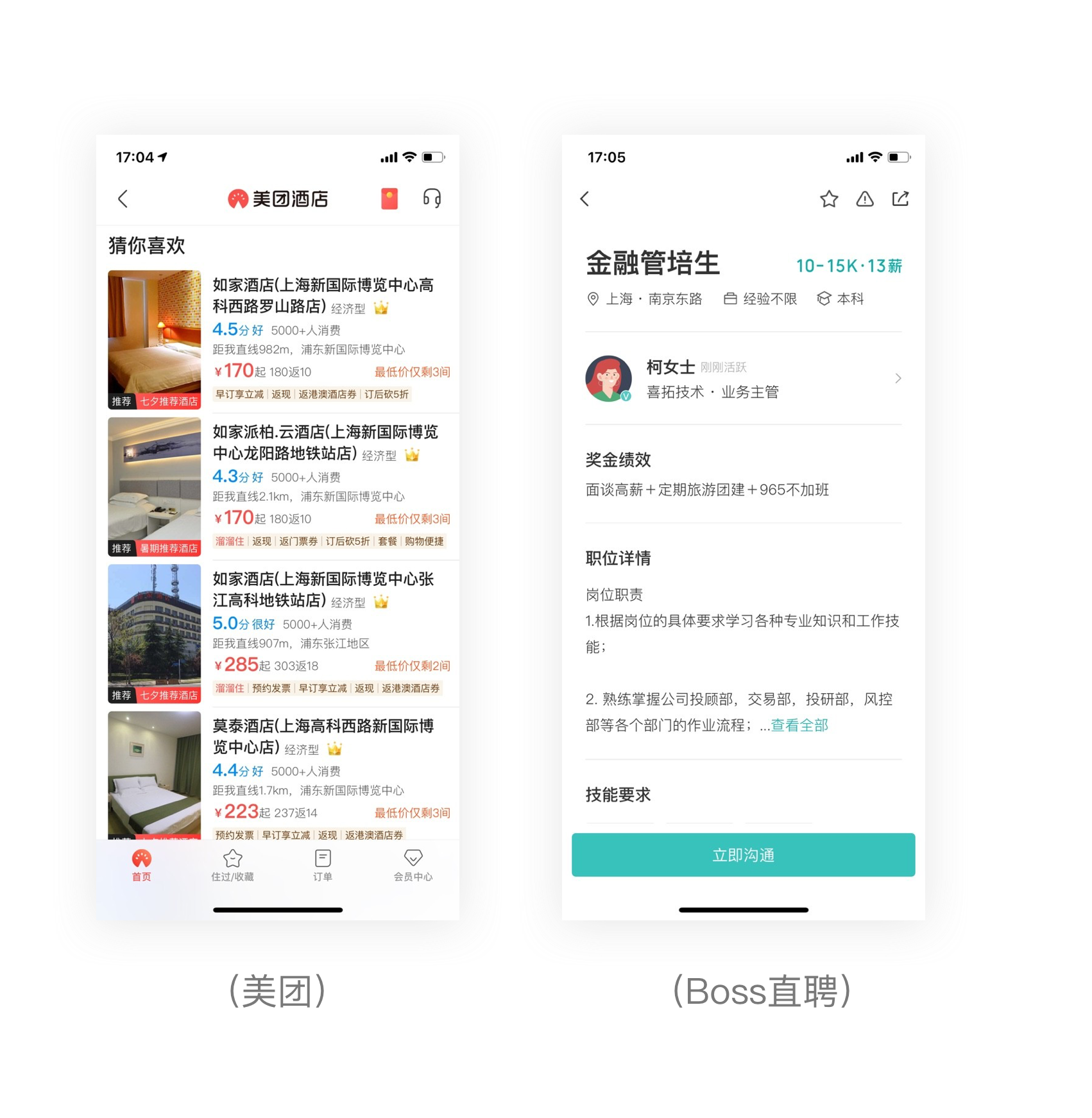 左圖是美團(tuán),酒店列表的第一層級文字從大小、字重與明度上拉開了對比,而第二第三層級的文字對比就比較微弱,這樣的處理方式可以讓標(biāo)題更突出,用戶有視覺焦點,從而視覺上更具層次,右圖的前程無憂也是同樣的處理方式。