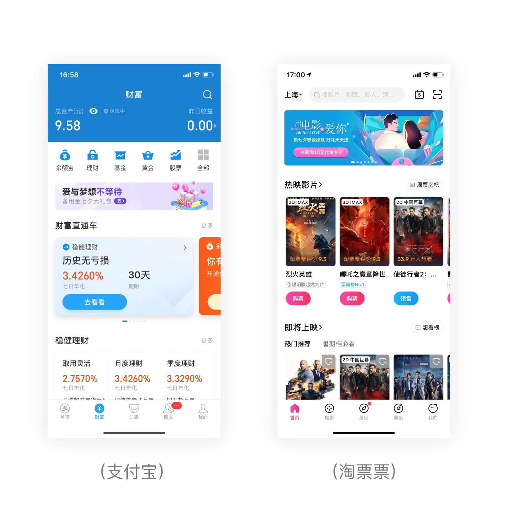 華為商城發(fā)現(xiàn)上的攝影專區(qū)、華為新聞、玩機(jī)資訊、購機(jī)攻略等采用對比色進(jìn)行強(qiáng)調(diào)對比,進(jìn)入頁面用戶就能夠清楚這些模塊的分類,同時引導(dǎo)用戶關(guān)注下方的商城信息。淘票票首頁中的按鈕、引導(dǎo)提示、標(biāo)簽欄選中均用了紅色進(jìn)行強(qiáng)調(diào)對比,很容易引起用戶的注意,讓用戶看一眼就知道如何操作。支付寶財富中的財富直通車采用色彩明亮的卡片展示,很容易引起用戶操作的興趣。