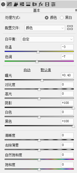 為了使得暗部等細(xì)節(jié)呈現(xiàn)出來,整體照片有點(diǎn)發(fā)灰的感覺,我們需要將陰影和黑色提升到100%。這步是為了實(shí)現(xiàn)②暗部偏灰,低對比度,朦朦朧朧感覺。