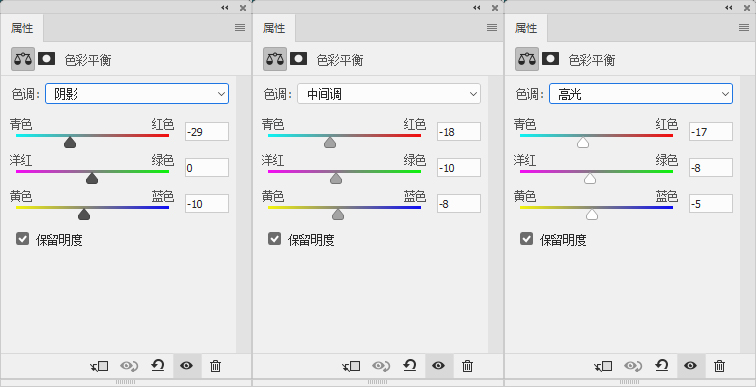 接下來我們要進(jìn)行整體調(diào)性的調(diào)整,也就是實(shí)現(xiàn)④整體調(diào)性偏青藍(lán)。我們進(jìn)入PS主界面進(jìn)行操作,選擇色彩平衡工具。在陰影、中間調(diào)、陰影里面加入青色和藍(lán)色,這時(shí)加的力度一定要大。