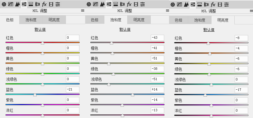黑白調(diào)整完后,整體的顏色過于鮮艷,所以選擇HSL工具對畫面中的顏色進(jìn)行單獨(dú)調(diào)整。