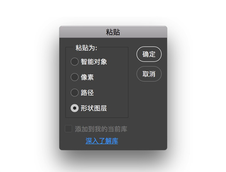 打開此AI文件,選中所有元素,command+c復(fù)制。然后打開PS,新建合適畫布,command+v粘貼。此時出現(xiàn)下圖,選擇“形狀圖層”并確定。