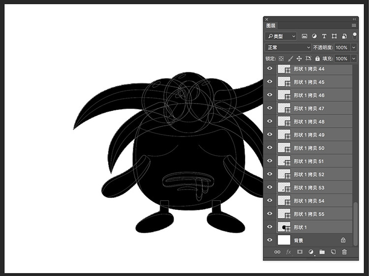 其實此時路徑已經(jīng)順利導(dǎo)入了,接下來就要進行非常麻煩的操作“分離”。即把路徑分離成不同的圖層,方法為“Ctrl+Shift+Alt+J”,此圖各元素分離后出現(xiàn)56個圖層。