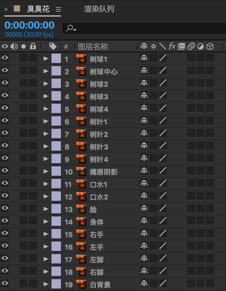 導(dǎo)入的AI文件雖然都分層了,但每個圖層的物理中心都為整個畫布的中心,調(diào)整起來也非常非常麻煩,試過都知道的,更關(guān)鍵的是,這些圖層也只能進行“位移、旋轉(zhuǎn)、透明度、縮放”這些基本的操作。怎么進行優(yōu)化呢。只需要一步操作,見下圖。
